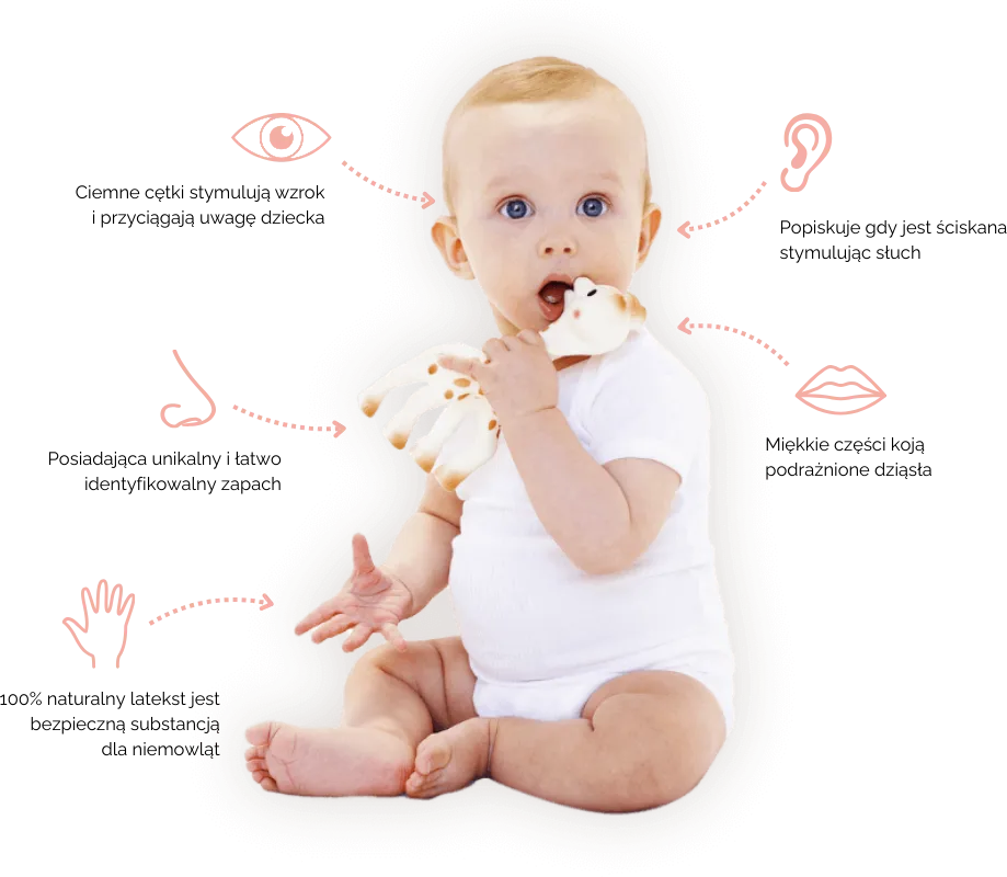 Szczególny zapach naturalnego lateksu z drzewa HEVEA powoduje, że Sophie jest wyjątkowa i łatwa do odróżnienia i rozpoznania pośród innych zabawek dziecka.